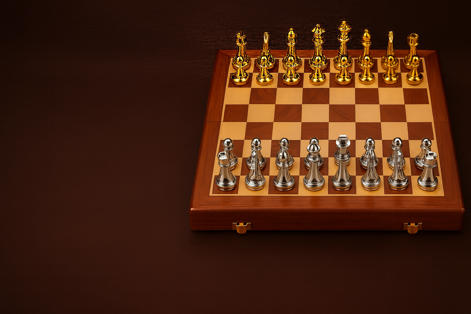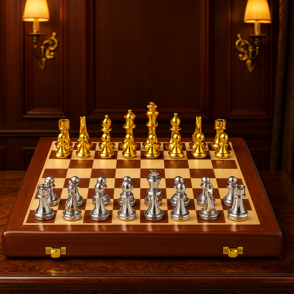 Jeu d’échecs avec plateau en bois et pièces en zinc doré et argenté